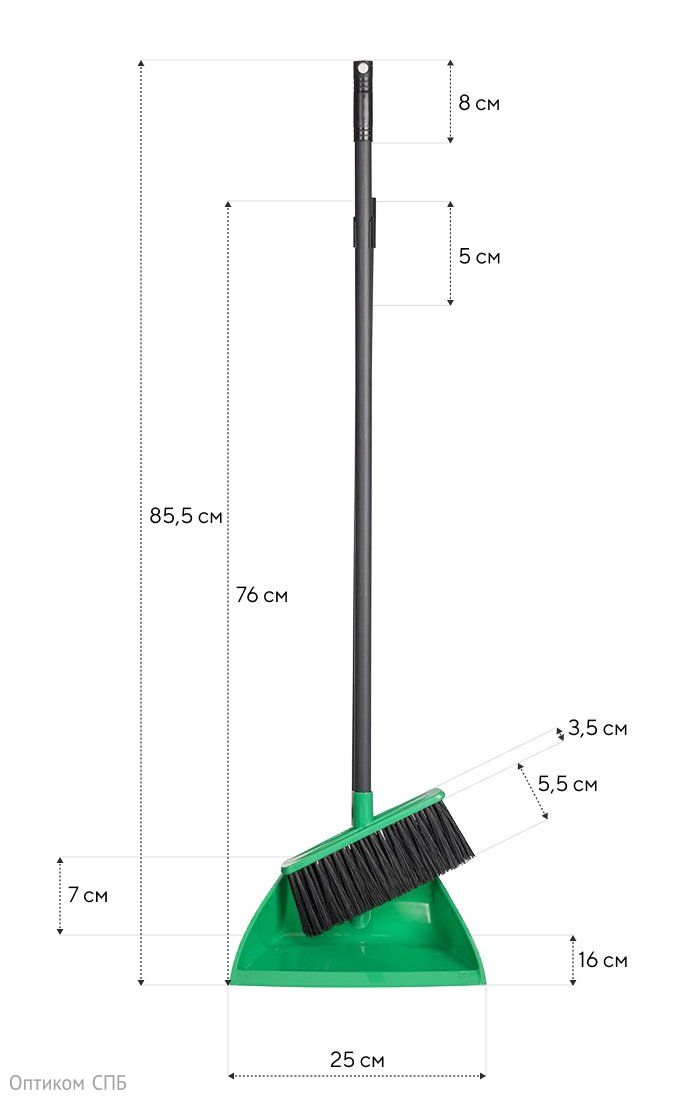 Комплект для уборки Optiline Ленивка обеспечивает удобство и функциональность. Включает в себя щетку и совок для сухой уборки внутренних помещений. Вместительный пластиковый совок имеет сглаженную кромку, благодаря которой удобнее собирать мелкий мусор. Щетка оснащена длинной щетиной для сбора мусора различного объема, позволяет извлекать мелкий мусор из труднодоступных мест. Ручки щетки и совка крепятся между собой для компактного хранения. Цвет зеленый.